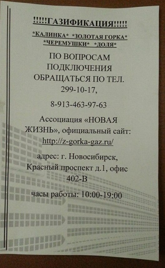 На въезде выдали красивую бумажку с информацией об Ассоциации "Новая Жизнь", проводящей газификацию, с "официальным" интернет адресом ,очень похожим на наш адрес , сравните http://www.z-gorka-gaz.ru ) ,