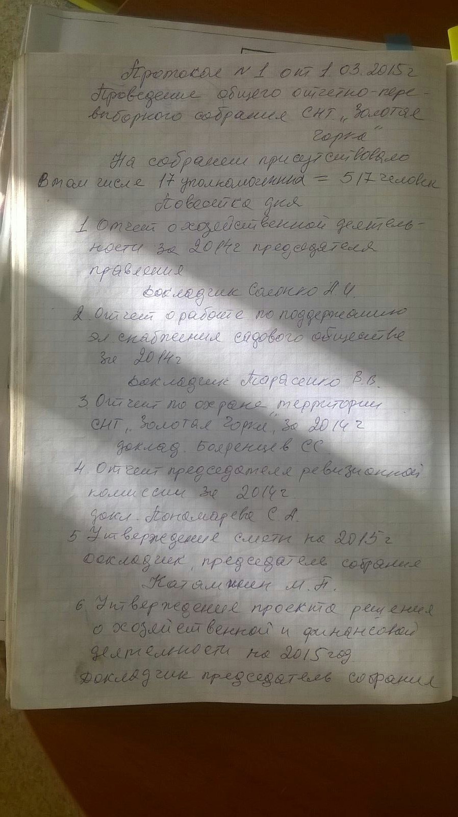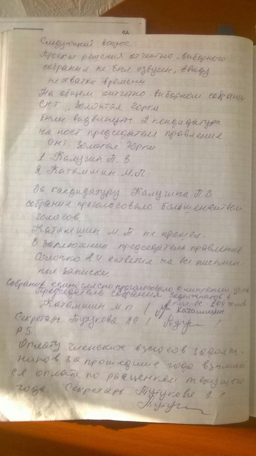 сначала обратите внимание на протокол общего собрания, который у нас уже есть на сайте и на последнюю страницу внимательно ,приписку об единогласном исключении 104 должников из СНТ. Она явно написана после написания протокола, да и было ли оно, единогласное голосование о лишении 104 участков ??? Скажите мне кто еще был на собрании что это было. И куда простите делись эти отчужденные участки?