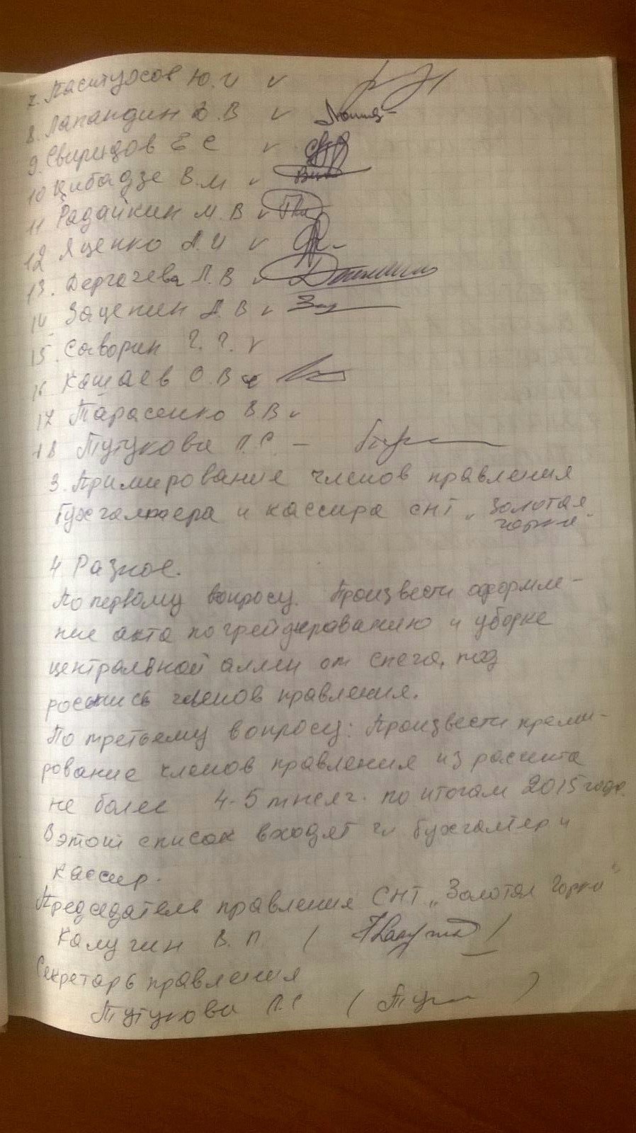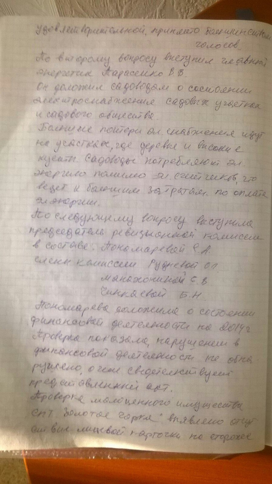 из данного протокола общего собрания видно, что проверка хозяйственной деятельности СНТв 2014 году нарушений не выявила, казалось бы все хорошо, если не обратить внимания на одно несоответствие.... 2 члена ревизионной комиссии на самом деле не являются членами ревизионной комиссии.