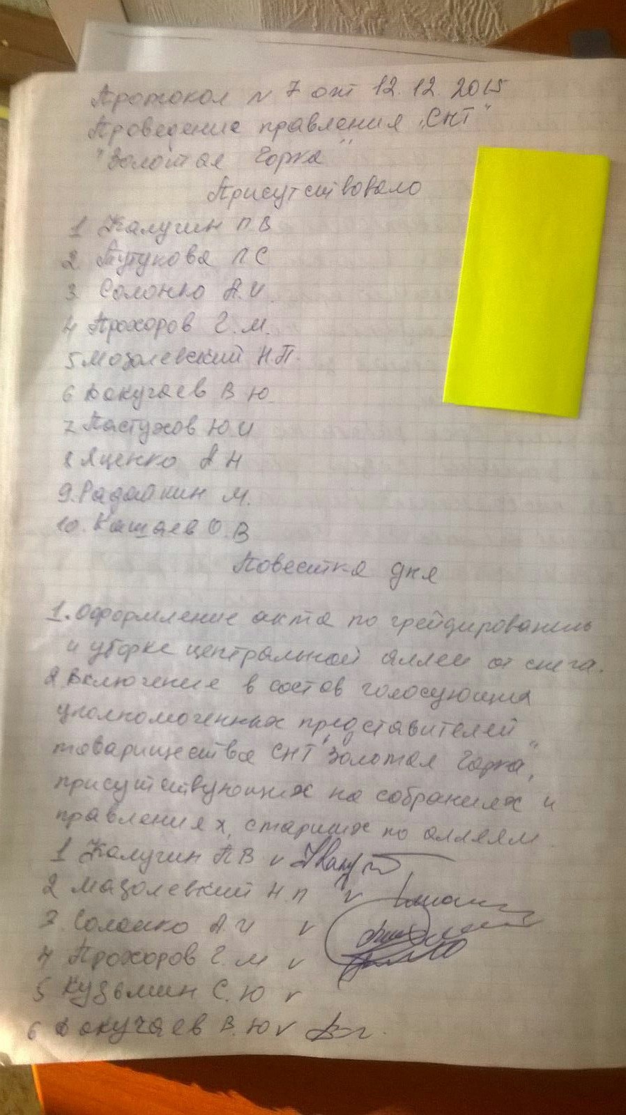 ПО порядку, григорий , позиция вашего отношения к председателю - мой сарказм . Если Вы считаете , что протокол подделал секретарь, вписав туда уполномоченных, а Калугин этого не знал,то почему эта бумага попадает в суд в измененном виде как официальный документ из рук Солонко ? Из рук нынешнего заместителя председателя правления ,из рук тогдашнего председателя, проводившего некворумное собрание ? Солонко и юрист приносят в суд протокол общего собрания за подписью Калугина , в котором черным по белому внесены изменения- дописаны члены СНТ для кворума. Да еще и на судебное разбирательство о нелигитимности некворумного собрания ? Что , не он ,ни Калугин этого не знали ?? Виноват с секретарь ?)))))) Но если мы то можем видеть настоящий протокол, выложенный на сайте в 2015 году ( viewtopic.php?f=2&t=113&start=20 ) , и мы были на собрании на котором не оглашалось что присутствуют уполномоченные , их имена,и за кого они имели право голосовать , что можно посмотреть в видео на открытии собрания, то за кого,простите, тогда принимают садоводов ? Вас, меня, всех ? это что касается подписи.